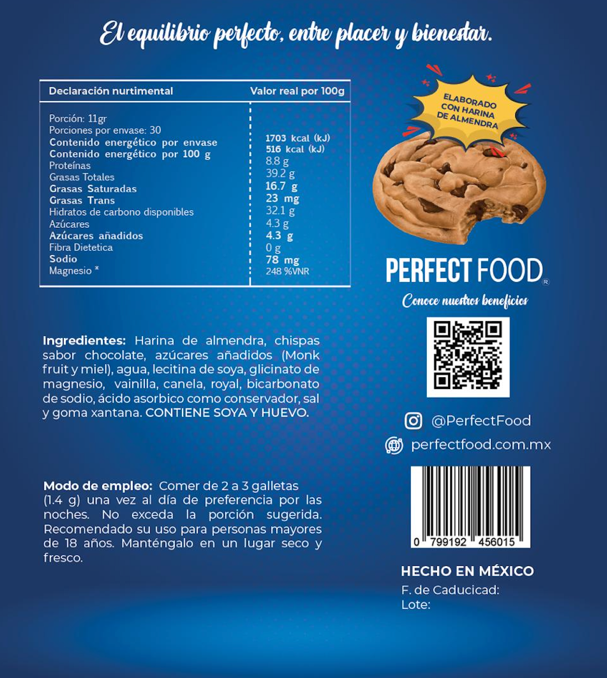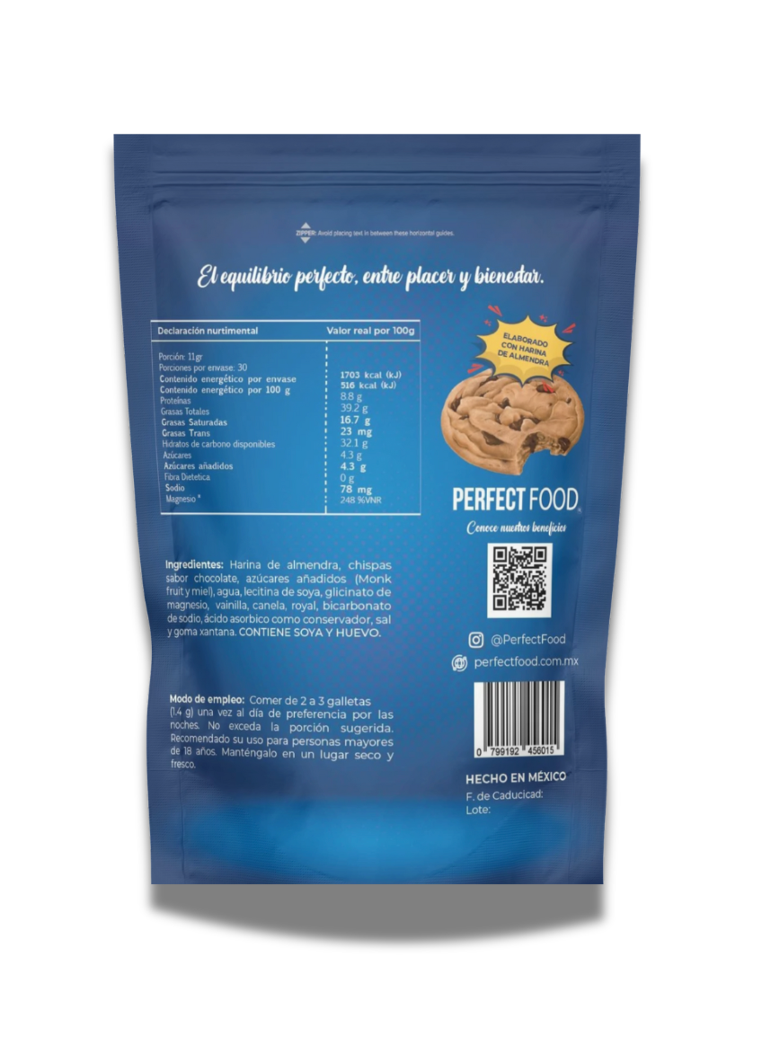 ✅ Ingredientes: Harina de almendra, huevo, goma xantana, lecitina de soya, royal, monk fruit, miel, vainilla, bicarbonato de sodio, sal, canela, glicinato de magnesio, ácido ascórbico y chispas de chocolate.